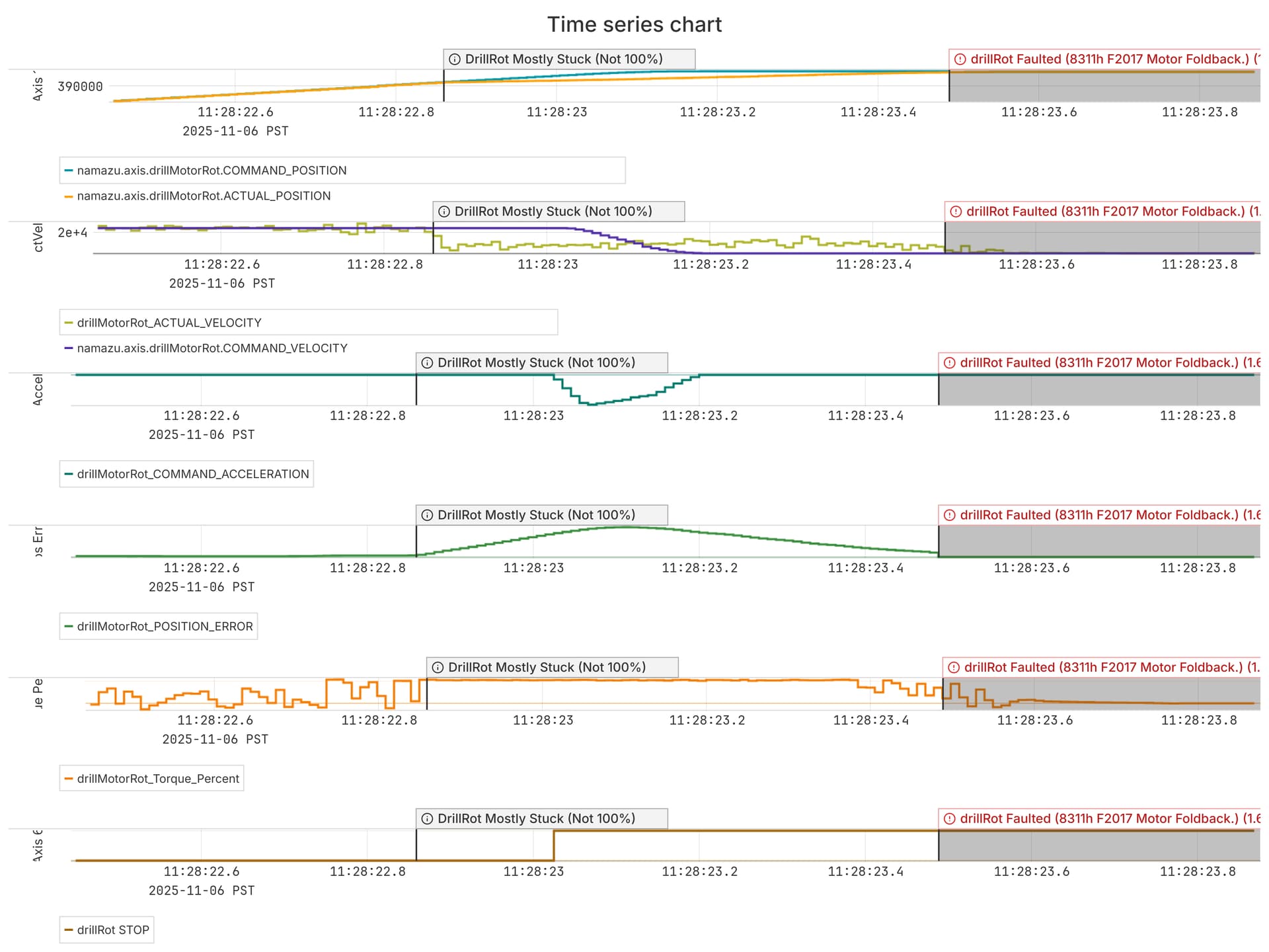 We have an axis where we are commanding a MoveVelocitySCurve() move. Sometimes this axis gets stuck during the move and a large position error builds up. We are okay with this. But when we command another MoveVelocitySCurve() to 0 deg/s and then Stop() the axis, the Commanded Velocity goes to 0 but the Actual Velocity is maintained and the axis keeps moving for about half a second until we get a Motor Foldback fault on the Kollmorgen Drive.